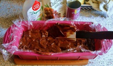 Foremkę keksową wyłożyć folią spożywczą, wlać czekoladową masę, przestudzić. Trzymać w lodówce. Podawać pokrojoną w plastry.