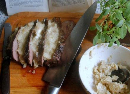 Przygotować farsz. Upieczone cebule zmiksować z masłem i tartą bułką. Farsz doprawić solą i pieprzem. Mięso przekroić ukośnie, nie docinając do końca. Nacięcia między plastrami wypełnić farszem.