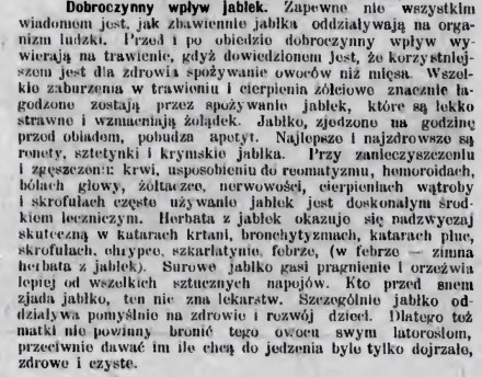 (…) Jabłko przez zawartość najcenniejszych dla organizmu soli, żelaza i fosforanów, jest królem owoców, powinno być wyróżniane w szczególności w wypadkach przemęczenia pracą umysłową, anemji, artretyzmu, neurastenji, w każdym wieku.