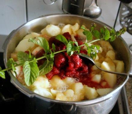 Nie miałam spadów, nie chciałam się bawić w wyciskanie soku. Jabłka obrałam, pokroiłam w ćwiartki, zasypałam oszczędnie cukrem i dusiłam we własnym soku. Do jasnych jabłek dodałam – bardziej dla koloru niż smaku – trochę malin i listki mięty truskawkowej (jest taka!). Kto chce, może jabłka całkiem rozgotować, a nawet przetrzeć czy zmiksować. Ja wolę, gdy w musie można znaleźć ćwiartki owoców. Słoiczki różowego jabłkowego przetworu pięknie wyglądają na kuchennej półce. A zimą będzie je można otworzyć, gdy „niczego nie ma w domu”, dodać do naleśników albo… schabowych kotletów. Wtedy trzeba będzie je przyprawić na ostro i słono: solą i pieprzem.