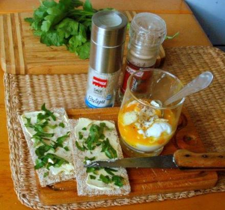 Jajka włożyć do zimnej osolonej wody, musi je przykrywać (jeżeli jajka wypływają na wierzch, oznacza to, że nie są niestety zbyt świeże; lepiej zużyć je do sporządzenia ciasta, klusek itd.). Od chwili, gdy woda zawrze, gotować je 1,5 minuty (jajka średniej wielkości). Białko ma się ściąć, żółtko ma pozostać płynne. Wyjąć, wstawić do miseczki z zimną wodą na chwilkę. Obrać ze skorupek tak, aby białka pozostały całe. Włożyć do nagrzanej szklanki. Dołożyć łyżeczkę (lub dwie) masła, posypać solą i świeżo zmielonym pieprzem. Do szklanek dołożyć posiekaną zieleninę lub posypać nią pieczywo. Jajka rozbełtać już podczas jedzenia.