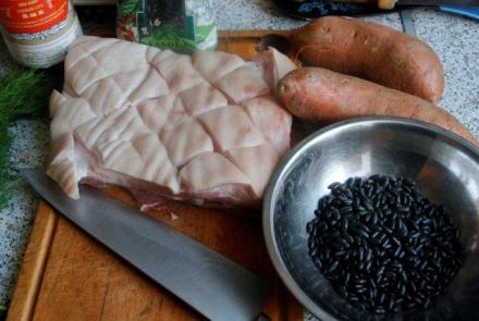 Boczek obgotować krótko w wodzie. Osuszyć. Skórkę naciąć w romby. Natrzeć sosem sojowym i przyprawami także w nacięciach, obsmażyć na patelni do smażenia beztłuszczowego. Wstawić do piekarnika, piec przez godzinę w temperaturze 200 st. Najlepiej upiec w brytfance z kratką, pod którą podlać tyle wody, by mięso do niej nie dotykało. Boczek będzie gotowy wtedy, gdy nóż go nakłuwający wejdzie w niego prawie jak w masło.