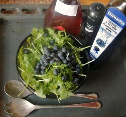 Zamiast borówek można dać i inne owoce: truskawki, maliny, ale także śliwki pokrojone w paski. Kto nie ma octu owocowego, może dać ten z czerwonego wina. Zwykle proporcje oliwy i octu to trzy do jednego.