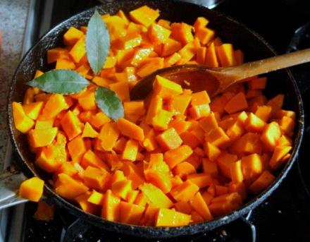 3. Na patelni rozgrzać kaczy tłuszcz. Włożyć dynię i smażyć, aż się zrumieni.