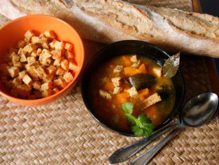 Tłuszcz z kaczki można wytopić samemu. Ale ostatnio pojawił się taki w słoiczkach. Pochodzi z Francji. Wciąż nie ma u nas tej okrągłej rzepy stosowanej często we Francji i obecnej tam we wszystkich warzywniakach. Szkoda. Zastąpiłam ją kawałkiem selera korzeniowego. Do duszenia dyni i potem do garnka z zupą dałam świeże listki laurowe. Smak pewnie nieco to zmieniło, ale go nie zepsuło. Wzięłam o połowę mniej słoniny. Właściwie można z niej w ogóle zrezygnować i jeśli kiedyś ugotuję tę zupę, raczej tak zrobię. Oddzielnie podam wtedy plasterki boczku wysmażone na chrupko. Nie podałam zupy na kromkach żytniego chleba. Nie przepadam za pieczywem tak rozmiękczonym (choć z tej zupie na pewno będzie smaczne!). Podałam za to oddzielnie świeżą bagietkę i chrupiące grzanki, co ma tę zaletę, że każdy tyle zje pieczywa, ile mu będzie pasowało. Wreszcie: oddzielnie podałam posiekane listki i gałązki świeżej kolendry. Do dyni bardzo mi pasuje, może na skutek wspólnego z nią pochodzenia z Ameryki Środkowej.