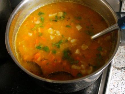 Przepis przytaczam wiernie, jako cytat. Sama nieco zmieniłam składniki i proporcje oraz sposób podania zupy, ale o tym wspomnę na końcu, pod przepisem. Było to bardzo fajne gotowanie. Zapach zupy pyrkoczącej w garnku zawsze krzepi. A ta dodatkowo ma wesoły kolor.