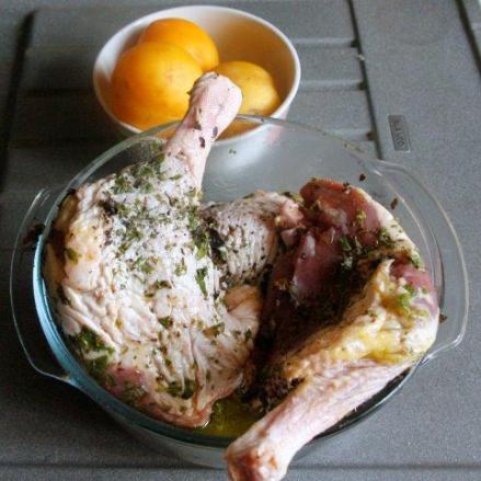Udka kacze obmyć, osuszyć, tłuszcz przy nich pozostawić. Suche natrzeć ziołami i solą, odstawić co najmniej na godzinę (można to zrobić w przeddzień pieczenia).