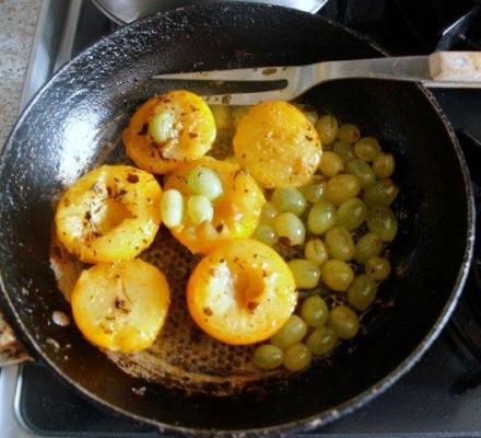 Śliwki przepołowić, usnąć z nich pestki. Na patelni, w której były smażone udka, rozgrzać wytopiony z nich tłuszcz; gdyby go było za mało, dołożyć łyżkę kaczego tłuszczu (można taki kupić) lub ewentualnie łyżkę innego tłuszczu – klarowanego masła lub oleju. Na rozgrzany tłuszcz wyłożyć połówki śliwek, posypać je ziołami (tymi samymi, co kaczka) i pieprzem, obsmażyć z jednej strony. Odwrócić, dodać winogrona.
