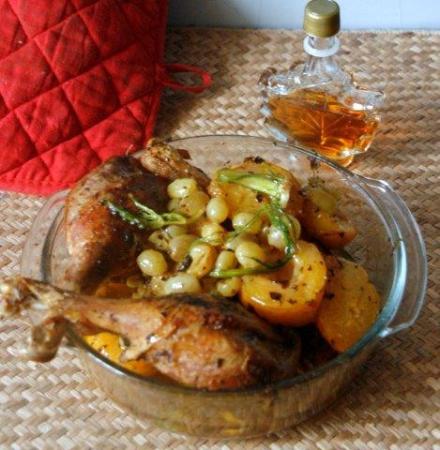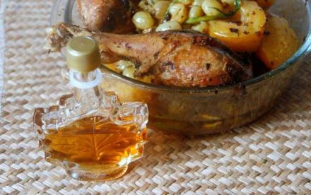 Ale, wróćmy do kaczych udek. Zalecam ich długie pieczenie w niskiej temperaturze. Efekt będzie pewny: mięso stanie się miękkie i soczyste. Do udek dodałam jesienne owoce. Lubię korzystać z sezonowych skarbów dostępnych na warzywniakach. A o tej porze roku są one najbogatsze. Do nadania potrawie ostatecznego szlifu wykorzystałam także coś słodkiego. Syrop klonowy. Dostałam go w prezencie (Irino, Bogusiu, wielkie dzięki!). U nas także można go kupić. Nie jest, niestety, tani, ale warto się wykosztować i trzymać go na dania podane od wielkiego dzwonu – mięsne (nie tylko drób, ale i żeberka) lub słodkie (klasyczne będą naleśniki).