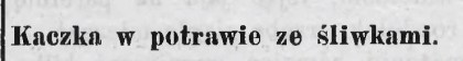 A może udka tak pieczone będą dla kogoś zbyt słodkie? Tym, którzy wolą smaki mocniejsze i nie słodkie, proponuję przepis na kaczkę ze śliwkami węgierkami. Opisuje przyrządzanie całej tuszki, ale tak można zrobić i udka. Są duszone, a więc z pomysłu mogą skorzystać też świeżo upieczeni kucharze lub kucharki, czujący lęk przed piekarnikiem (uzasadniony, pieczenie wymaga jednak wprawy!). Kaczka duszona na sto procent będzie miękka. Przepis podał tygodnik „Dobra Gospodyni” w roku 1911. Nazwa z tytułu, czyli „potrawa” (czasem także „potrawka”), oznacza, że mięso jest gotowane lub duszone w odróżnieniu od pieczonego, nazywanego „pieczystym”. Cytaty podaję jak zwykle wiernie, z zachowaniem pisowni.
