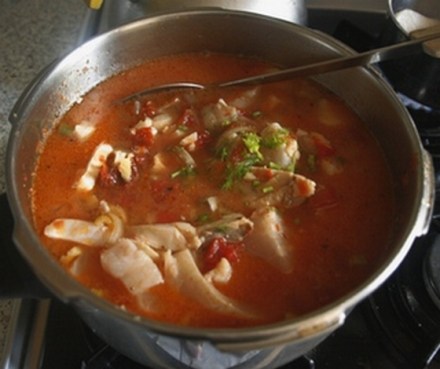 Ryby pokroić w kawałki. Wrzucać kolejno do wywaru. Gdy będą gotowe (sprawdzić, bo różne gatunki ryb są gotowe w różnym czasie), wyjmować je na głębokie talerze i zalewać wywarem. Przed podaniem dorzucić odłożone krewetki i mątwę (nie gotować ich za długo).