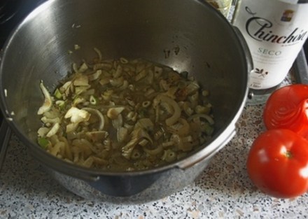 Gdy płomień się wypali, zalać warzywa bulionem, dodać pomidory obrane i pokrojone w kostkę, przecier pomidorowy do smaku, wrzucić przyprawy: szafran (ten w kłaczkach można krótko uprużyć na suchej patelni, aby wydobyć z niego smak), pokruszone papryczki, liście laurowe, sól, pieprz, cukier. Wywar gotować co najmniej przez kwadrans. Wrzucić do niego oczyszczone krewetki i pokrojoną mątwę. Gdy krewetki zmienią kolor (surowe, a te gotowane, gdy się ledwie zagotują), łyżką cedzakową wyjąć je razem z podgotowaną mątwą i odstawić.