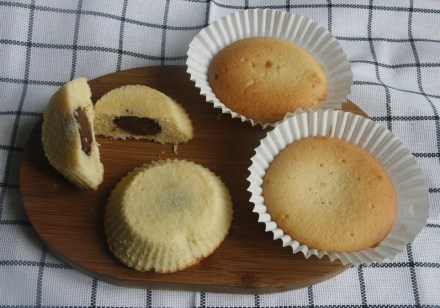 Przepis podaje, że z podanych składników można wykonać 36 charakterystycznych ciasteczek, dzięki specjalnym foremkom prążkowanym jak muszelki. Ale chyba bardzo małe te foremki z przepisu. Do moich foremek wlałam ciasto na 18 magdalenek. Ciastem napełniłam także cztery papierowe foremki do babeczek czy muffinów. Wlałam do każdej połowę ciasta, włożyłam łyżeczkę nutelli i przykryłam znowu ciastem. Piekłam razem z magdalenkami. Babeczki z czekoladowym nadzieniem były pierwsza klasa!