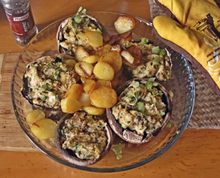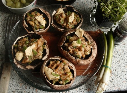 Kupiłam wielkie brązowe pieczarki nazywane portobellami. Idealnie się nadają do nadziewania. A ze względu na rozmiar śmiało można je przeznaczyć na całe danie obiadowe. A nie jako dodatek do sarny lub wołowiny! Są przy tym mięsiste i mocne w smaku. (Nawiasem, poza nadziewaniem są świetne podane jako grillowane; kiedyś takie opisałam). Ale na razie – jak nadziałam pieczarki portobello.