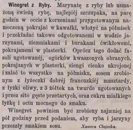 A na koniec trzeci przepis na winegret. Pod tą nazwą sałatka w polskich książkach kucharskich występuje rzadko, a właściwie w mnie dostępnych takiej nie spotkałam! U Aliny Gniewkowskiej, która swoją „Współczesną kuchnię domową” wydała w Kijowie w roku 1917, jest – jak należy – vinaigrette ze śledzia. Podobny do mojego, tyle że z dodatkiem ogórków i grzybków marynowanych, bez jabłka. Jedyna sałatka winegret, w tej właśnie pisowni, na jaką wpadłam, pochodzi z „Gospodyni Wiejskiej”. Było to „pismo illustrowane dla kobiet poświęcone gospodarstwu domowemu, obejmujące Gospodarstwo mleczne, Hodowlę zwierząt domowych, Ogrodnictwo, Pszczelnictwo, Jedwabnictwo i wszelkie gałęzie wchodzące z zakres zajęć kobiecych”. Gotowanie jak wiadomo, w zakres wchodziło, pismo zamieszczało więc i kulinaria. Ukazywało się w końcu wieku XIX. I właśnie w nim, w roku 1879, znalazłam winegret. No, cóż. Tygodnik ukazywał się w Warszawie, w Prywiślanskim Kraju, wpływy rosyjskie, także w kuchni, były nieuchronne.