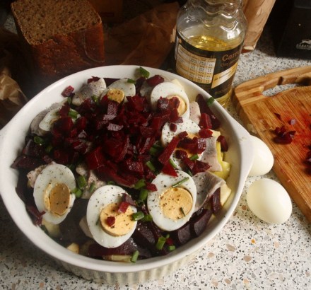 To zapraszam do przyrządzenia winegretu ze śledziem. Danie w sam raz na jesień. Podajemy je z pachnącym razowym chlebem i kieliszkiem czystej wódki. Wódka nie jest niezbędna, ale podkreśli rosyjski charakter sałatki, no i wzmacnia jej wyborny smak.