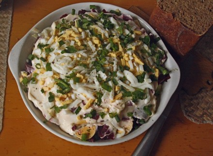 Ugotować 800 g ziemniaków, pokroić je w cienkie plasterki. 2 oczyszczone śledzie i 2 cebule posiekać. 2–4 żółtka z ugotowanych na twardo jajek rozetrzeć gładko z dwiema łyżkami nicejskiej oliwy i dwiema łyżeczkami musztardy. Doprawić pieprzem, kaparami, octem estragonowym. Podać po wymieszaniu.
