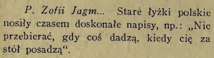 A te łazanki to jedzono łyżką czy widelcem? Jeżeli łyżką, to może taką staropolską, z napisem. Jakim? Przykład podała inna czytelniczka „Naszego Domu”: