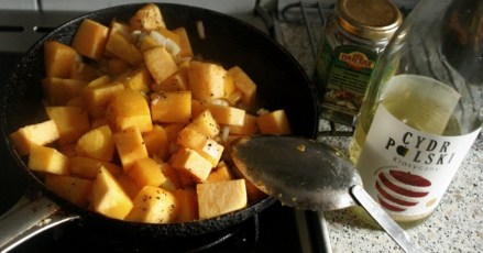 Dynię mieszać i smażyć przez kilka minut, aby każda kostka pokryła się przyprawami. Skropić cydrem, przykryć, dusić kwadrans. Dynia ma zmięknąć, lecz się nie rozgotować. Przed podaniem posypać świeżymi ziołami.