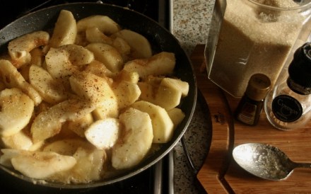 Jabłka obrać, pokroić w ćwiartki, wymieszać z cynamonem. Wrzucić do karmelu, smażyć mieszając, aby pokryły się karmelem z każdej strony i lekko zmiękły (nie rozmiękły).