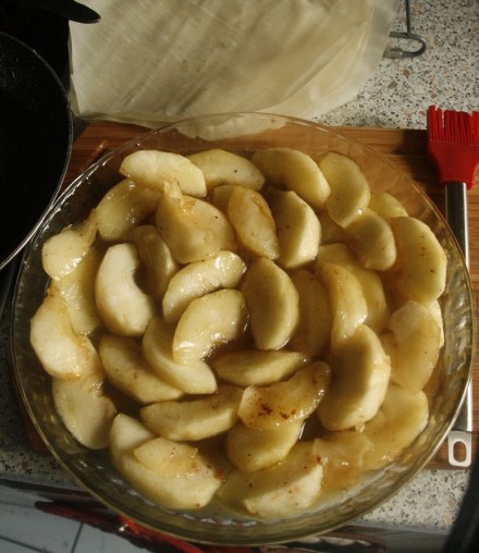 A teraz wróćmy do współczesności. Proponuję upiec ciasto nowoczesne, lekkie, szybkie i łatwe do przygotowania. A przede wszystkim: nie zajmujące wiele czasu. Nazwa ciasta – Tatin – pochodzi od nazwiska dwóch sióstr, które wymyśliły ten charakterystyczny wypiek i nazwały go „tartą odwracaną”. Dopiero jednak, gdy tartę poznał Paryż – a jak pisze „Larousse gastronomique”, podano ją w słynnej restauracji u Maxima, ciasto zrobiło się sławne. Pierwotnie robiło się je z jabłek lub gruszek. Dzisiaj wypieka się nawet tarty tatin z warzywami. Ciasto ma być kruche, łatwe do wyrobienia, ale mnie przyszło do głowy, by rzecz uprościć jeszcze bardziej. I przyrządzając tę tartę skorzystać z gotowego ciasta filo. Można kupić już schłodzone lub mrożone te cienkie jak pergamin płatki ciasta. Pochodzi z Turcji, ale zadomowiło się i w Grecji. Znają je właściwie całe Bałkany, wyrabia się z nich m.in. znane wschodnie ciasto – bakławę.