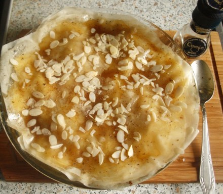 Na nich ułożyć cztery arkusze ciasta, wycięte w koła wielkości foremki, kolejno smarowane roztopionym masłem (zgodnie z przepisem na opakowaniu). Ostatni arkusz zagiąć, aby przylgnął do foremki. Posmarować pozostawionym karmelem i posypać płatkami migdałów oraz cynamonem z młynka.