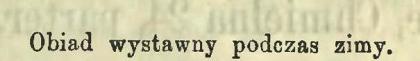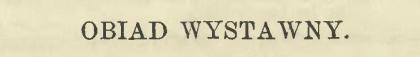 Nie tak błyszczący, nie tak świetny jest stół pani Ćwierciakiewiczowej, będący okazem gustownej zastawy obiadowej na dwanaście osób. W pośrodku talerzy, widzimy dzieła o sztuce kucharskiej, dzieła znane z dobroci i popularności.