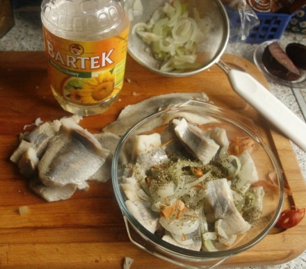 Filety śledzi namoczyć najpierw w wodzie, potem w mleku. Gdy są słone na nasz smak, wyjąć je, obsuszyć, pokroić na zgrabne kawałki. Cebulę pokroić w półplasterki, zblanszować we wrzątku.