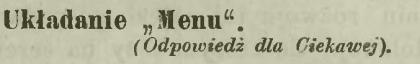 Aby ułożyć takie „menu”, któreby odpowiadało wszelkim niezbędnym zasadom sztuki kulinarnej, z zastosowaniem produktów i nowalji sezonowych, potrzeba najpierw wielkiej znajomości tejże sztuki, potem wprawy i rutyny połączonej z pewną fantazją. To też [!] taka mała karteczka, na której nieraz nie więcej nad 10 wierszy się znajduje, jest w tej samej mierze obrazem kuchni i zdolności kucharza lub smaku gospodyni, jak pismo jest obrazem charakteru człowieka.
