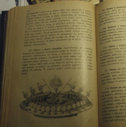 Najpierw jednak nieco teorii. Będzie pochodziła z mojej wydanej przed laty, bo w roku 1996, „Encyklopedii kulinarnej”. Traktowała ona o kuchni historycznie, a teraz sama już jest historią. Cytat z samej siebie daję lekko zmieniony. Poprzedzę go zdjęciem z „Uniwersalnej książki kucharskiej” Marii Ochorowicz-Monatowej. Można na nim obejrzeć, jak elegancko podawano homara na przełomie wieków XIX i XX.