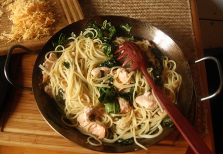 Do patelni ze szpinakiem włożyć łososia, wymieszać i podgrzać, a następnie dorzucić makaron. Zmieszać ponownie, posypać serem, szybko podawać.