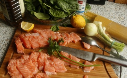 Przyszykować składniki dania: filet łososia pokroić w paski, posolić. Szpinak umyć, przesuszyć (można odwirować jak sałatę). Naszykować także dwie patelnie, rozgrzać na nich oliwę. W dużym garnku wstawić posoloną wodę na makaron. Zetrzeć ser.