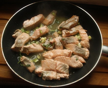 Na jednej patelni bardzo krótko przesmażyć paski łososia. Dorzucić do nich szczypior i natkę. Gdy będą usmażone z obu stron, skropić je sokiem z cytryny.