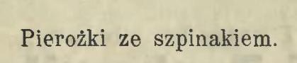 Zagnieść zwyczajne ciasto białkiem i wodą, jak na zwyczajne pierogi z mięsem. Mieć przygotowany szpinak, jak się zwyczajnie na jarzynę robi, bardzo starannie w donicy roztarty, lub jeżeli starszy fasowany przez sito. Na cienko rozwałkowane ciasto nakładać kupki szpinaku, jakby mięsa, zawijać tak samo i wykrawać kieliszkiem, aby były niewielkie. Gotować na bardzo obfitej wodzie solonej, a po wyjęciu łyżką durszlakową na półmisek, polać gorącem, ale nie rumianem masłem młodem i posypać cało tartym parmazanem [tak!], podając jeszcze oddzielnie parmezan na talerzu. Wyborne.