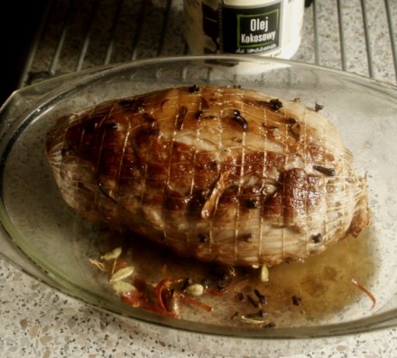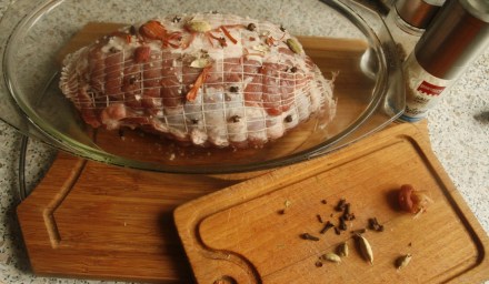 Wieprzowinę obmyć, osuszyć, jeśli trzeba zasznurować nicią kuchenną (do kupienia wśród kuchennych gadżetów). Ziarna kardamonu i pieprzu lekko zmiażdżyć (nasadą noża lub w moździerzu), kwiat muszkatołowy pokruszyć. Mięso natrzeć przyprawami i solą, wkłuć w nie goździki, odstawić pod przykryciem na noc w chłodnym miejscu lub co najmniej na godzinę w temperaturze pokojowej. Gdy jest schłodzone, wyjąć je na godzinę przed pieczeniem.