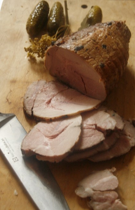 Tak upieczone mięso po zdjęciu wiążącej je siatki znakomicie się pokroi, trzeba tylko mieć naprawdę ostry nóż. Kroimy po 10 minutach od wyjęcia. Następnego dnia taką pieczeń można podać inaczej, bo duszoną. Jest też wyborną wędliną do kanapek. Opiszę to niedługo.