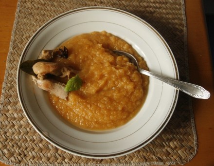 Gotować do miękkości rzepy (w szybkowarze trwało to 15–20 minut) i nabrania przez nią smaku. Rzepę wyjąć łyżką cedzakową, zmiksować, rozprowadzić wywarem, jeżeli zupa za gęsta. Mięso z udek zalać zupą, przybrać listkami świeżej mięty.