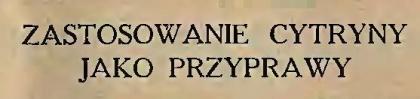 Zastosowanie soku z cytryny. Dodaje się łyżeczkę deserową soku cytrynowego do każdej kwarty wody, w której gotuje się rybę, bo to utrzymuje jej białość i ścisłość. Podając rybę smażoną, można podać cytrynę i nakropi jej sokiem rybę, co dodaje dużo smaku i zapachu. Sok cytrynowy jest niezbędny do ostryg, jak również jako doprawa do móżdżku, kokilek, główek cielęcych i t. d. Zastępuje on często nawet ocet w sałatach zielonych, sałatkach, majonezach. Ażeby utrzymać naturalny kolor warzyw, dodaje się do wody, w której gotujemy karczochy, szparagi, lub salsefję, łyżeczkę soku cytrynowego.