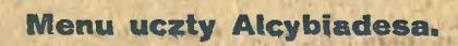 Słynny bon vivant Alcybiades wyprawił raz ucztę dla swych przyjaciół, której menu do dziś dnia zachowało się. Oto ono: głowy ryb morskich w sosie miodowym. Pieczone ptaszki. Kapłony marynowane w mleku. Combry wieprzowe. Kiszki baranie nadziane krwią. Wina rodyjskie i cypryjskie. Miód. Uczty odbywały się pod gołem niebem na miękkich materacach.