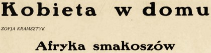 Afryka pociąga nas, bladych Europejczyków, przez błękit swego nieba, barwność ludów, zamieszkujących ją, tajemnicę odwieczną Islamu, jakieś niezrozumiale, a potężne życie tłumów. Ale o wszystkiem tem czytamy setki razy i niejedna z nas może, siedząc sobie jaknajwygodniej na kanapie, wyobrazić jak to wygląda w Algierze lub Fezie. Przynajmniej tak przypuszcza i, czytając później jaknajbardziej przeżyte wrażenia z podróży, myśli „znamy to, nic nowego”. To też zanim opowiadać będę czytelniczkom Ewy o tem, co widziałam w Afryce Północnej, opowiem Paniom najpierw o tem, co się tu jada. Bo świat ten wschodni różni się od naszego nietylko sposobem myślenia, odczuwania, ubierania, mówienia, sposobem życia i kochania, ale nawet sposobem odżywiania się. Nie dziwmy się, jeżeli szerokość geograficzna, a zatem klimat wpływa na rodzaj myślenia, to dlaczegóż nie ma to również oddziaływać na kuchnię dalekich narodów, czy to bezpośrednio wzbudzając inne apetyty i gusta, czy też pośrednio przez swą odmienną faunę i florę?