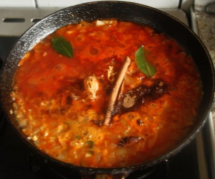 Usuń z patelni większość tłuszczu, dodaj 2 łyżki oleju, a następnie cebule i czosnek. Ustaw ponownie na średnim ogniu i smaż około 10 minut – mieszając od czasu do czasu i skrobiąc dno patelni drewnianą łyżką – aż cebula będzie miękka i złota. Dolej wino, doprowadź do wrzenia i gotuj dość energicznie przez 3 minuty, aż większość wina wyparuje. Dodaj połowę bulionu, pomidory, tymianek, liście laurowe, skórkę pomarańczy, cynamon, ziele angielskie, 1 łyżeczkę soli i trochę czarnego pieprzu. Dobrze wymieszaj i doprowadź do wrzenia. Włóż do sosu kawałki cielęciny i wymieszaj, żeby sos je pokrył.