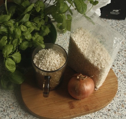 Ryż opłukać, obsuszyć. Cebule pokroić w drobną kostkę. Masło rozgrzać, cebulę trzymać z nim tak, aby zmiękła, ale nie zmieniła koloru. Dosypać ryż, mieszać, aby każde jego ziarenko pokryło się tłuszczem. Gdy ryż się zeszkli, zalać go winem. Gdy wino się wchłonie, wlewać porcjami bulion, przemieszać raz czy dwa razy. Gdy ryż mięknie, gdzieś po 20 minutach, dołożyć śmietanę i biały pieprz, a jeśli potrzeba – także sól. Ponownie wymieszać. Włożyć starty ser i raki, wymieszać, chwilę podgrzać. Posypać porwanymi na cząstki listkami bazylii.