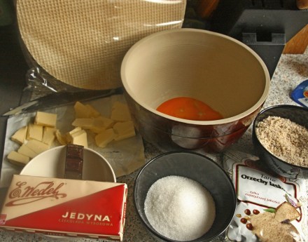 Orzechy przebrać, zemleć. Czekoladę rozgrzać na parze lub w piekarniku. Masło utrzeć na pulchną masę trzepaczką w kształcie rózgi, dodać żółtka, po trochu cukru, czekoladę lub kakao (zagotować z 5–6 łyżkami wody albo mleka), wanilię, spirytus, zmielone orzechy. Wszystkie składniki bardzo starannie utrzeć. Wafle podsuszyć w piekarniku, wyjąć, ostudzić, przekładać masą czekoladową. Za każdym przełożeniem wierzch dokładnie przycisnąć, boki wyrównać. Na wierzch położyć deseczkę, obciążyć. Gdy masa zastygnie, można torcik polukrować polewą czekoladową.