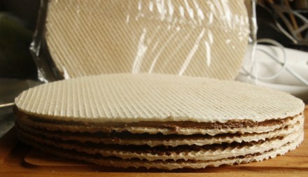 Masą wedle tego krakowskiego przepisu Zofii Szyc-Korskiej – bo to ona prowadziła kulinaria w IKC-u – przełożyłam kupione wafle. Nie były najcieńsze, ale na szczęście i nie najgrubsze. Kupując je koniecznie trzeba spojrzeć, czy nie są przeterminowane. Takie tracą szybko i bardzo na smaku.