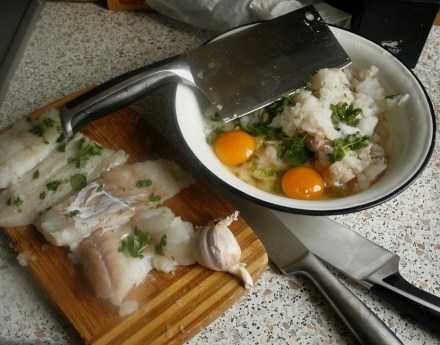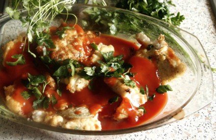 Nie byłabym sobą, gdybym nieco nie zmodyfikowała także przepisu. Otóż obok pulpetów ułożyłam kawałki filetów dorsza doprawionych tak jak one i obsmażonych. A zamiast mięty do posypania, aby zachować jedność smaku, wzięłam natkę i kolendrę już użyte do doprawienia ryby. Po polaniu sosem wszystko zapiekłam w przykrytym naczyniu. Pulpety wyszły bardzo smaczne i pikantne. W konsystencji były delikatne, dlatego bardziej zwarte filety bardziej mi odpowiadały. W sumie – danie warte przyrządzenia. Ze smażonymi filetami mniej zachodu.