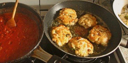 Na pulpety: zetrzeć chleb na okruchy. Rybę posiekać drobno, zmieszać z chlebem i pozostałymi składnikami, bez oliwy. Formować [rękami maczanymi w zimnej wodzie, przyp. mój] zwarte placuszki grubości 2 cm i średnicy 8 cm. Z podanych proporcji wyjdzie ich osiem. Włożyć na pół godziny do lodówki, zwłaszcza jeśli są bardzo miękkie. (Gdyby to nie pomogło, można oszczędnie dodać tartą bułkę).