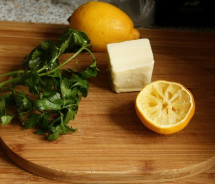 Sos ten „przygotowuje się na bazie holenderskiego sosu z dodatkiem białego wina i estragonu”. A więc jest mocno maślany i jajeczny, czyli wysokokaloryczny, z dużą zawartością tłuszczu. Pominęłam go. Klasykę zastąpiły względy zdrowotne. Zamiast sosu podałam masło à la maître d’hôtel, czyli, banalniej nazwane, masło pietruszkowe. Od niego zacznijmy.