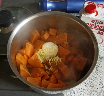 Ugotować w osolonej wodzie z nasionami kopru i liściem laurowym. Odcedzić (wywar zachować). Wymieszać ze świeżo startym imbirem, 2 łyżkami śmietanki i łyżką masła.