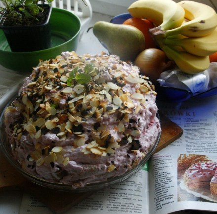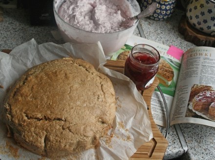 Mamy więc już borówki z własnego wyrobu lub te ze… sklepu. Takie, jak ja miałam. Można z nich przyrządzić krem na ciekawy tort. Biszkopt o zdecydowanym smaku, dość solidny w swojej masie, jest połączony z lekko kwaskowatym różowym kremem. Przepis zaczerpnięty ze starego pisma podaję we własnej wersji.