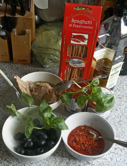 Nie bez powodu dodatkiem do makaronu z Puglii uczyniłam coś morskiego: tuńczyka. Wypatrzyłam niedawno słoiczki z całymi kawałkami tuńczyka w oliwie extra vergine. Te kupowane w puszce, nawet opisane jako kawałki, często są rozdrobnione i zwłaszcza w sosie się rozpadają. Przez szkło słoika widać było dobrze jego zawartość, czyli zwarte kawałki ryby. Solidne kawałki, które nie utworzą pasty, ale w sosie pozostaną w całości. Danie jest proste. Z kilku tylko składników. Można je gotować we dwoje. Albo w obecności drugiej osoby, siedzącej na stołeczku i sączącej – jak i my – jakieś primitivo. Sos przygotowuje się w mig. Potem niech popyrkocze z pół godziny. Gdy zjemy sałatę, podaną jako appetizer, będzie gotowy. Gotowanie makaronu potrwa z 8 minut; radzę go spróbować przed upływem czasu podanego na opakowaniu. W żadnym wypadku nie powinien być rozgotowany; najlepiej włączyć timer, który nas w porę wezwie do jego odcedzenia.